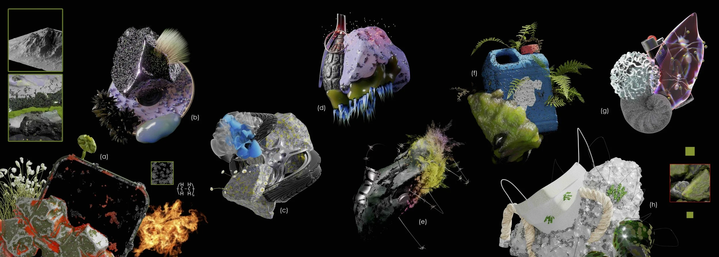 Technofossils a speculative collection of future fossils made from environmental pollution, technological waste, and materials linked to major social and economic events such as wars and pandemics. The organic and synthetic collide to form a possible future heritage of human-made artifacts that are embedded into the earth’s geological layers: just as bones once became stones, objects like industrial waste, cars, furniture, and smartphones may stay in the environment due to their synthetic, non-biodegradable nature.
